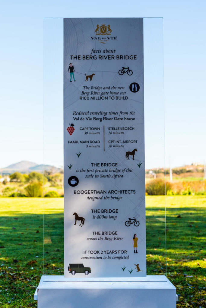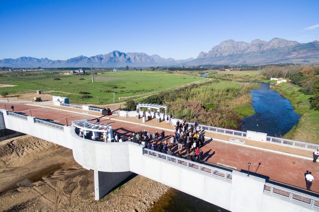 The new Val de Vie Estate bridge on the Berg River near Paarl was officially opened during June 2018. Hydrodynamic modelling of the Berg River flood flows was carried out by Prof Gerrit Basson during the detail design of the bridge. The 100 year flood flow is 700 m wide and the approach road on the floodplain is low not to obstruct the floodplain flow. Owner: Val de Vie Estate.