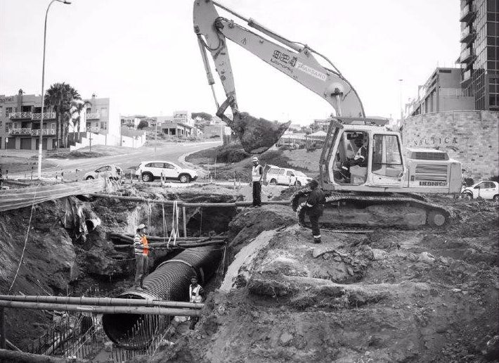 A new stormwater pipe of 1.4 m diameter was designed at Louis Fourie Road. The slope of the pipe is steep and needed a stilling basin to dissipate the energy before discharging into the ocean. Owner: Mossel Bay Municipality.